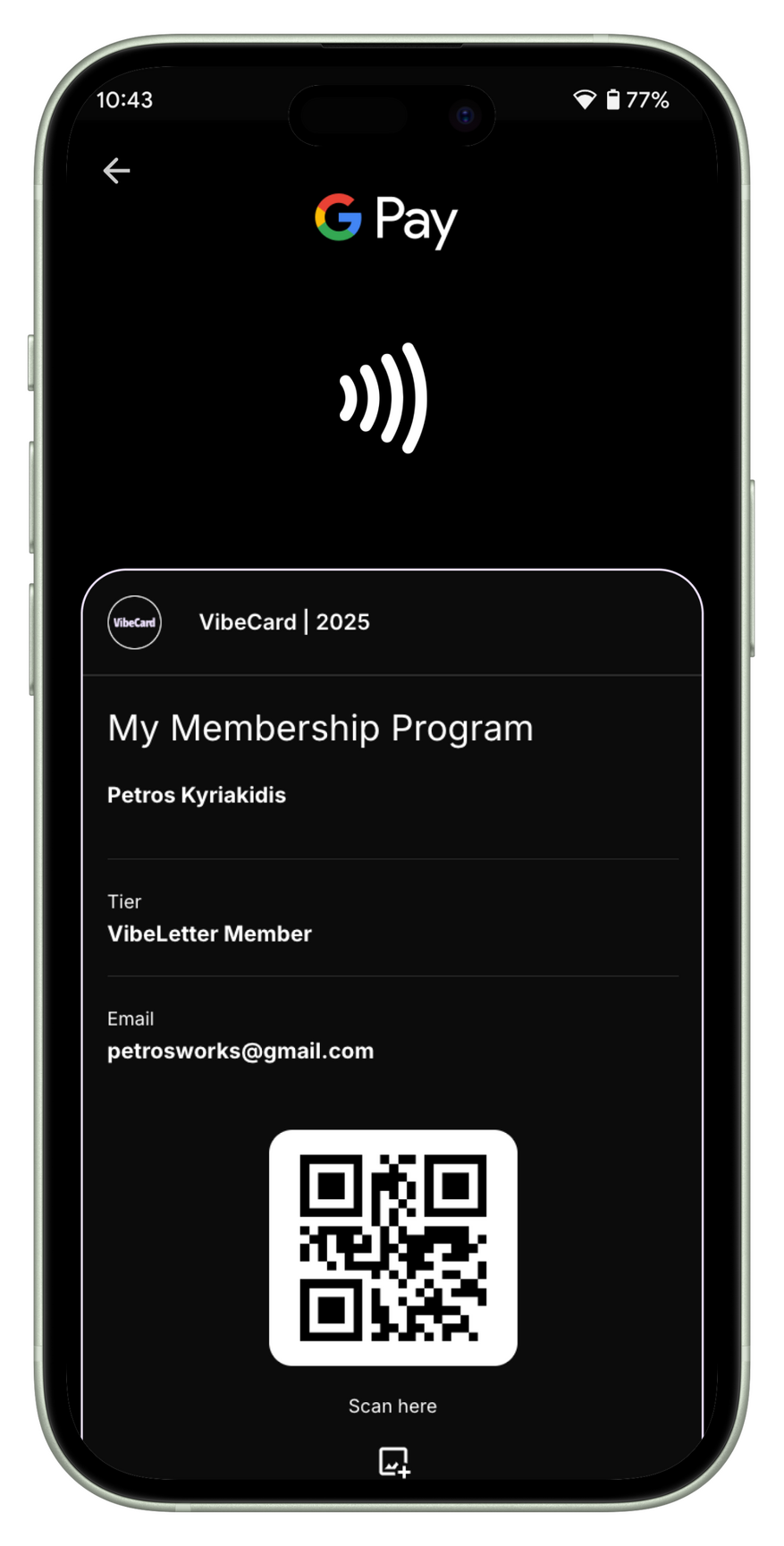 Η VibeCard είναι 100% ψηφιακή – παίρνεις άμεσα email με το link για να την κατεβάσεις στο κινητό σου (Apple/Google Wallet).
