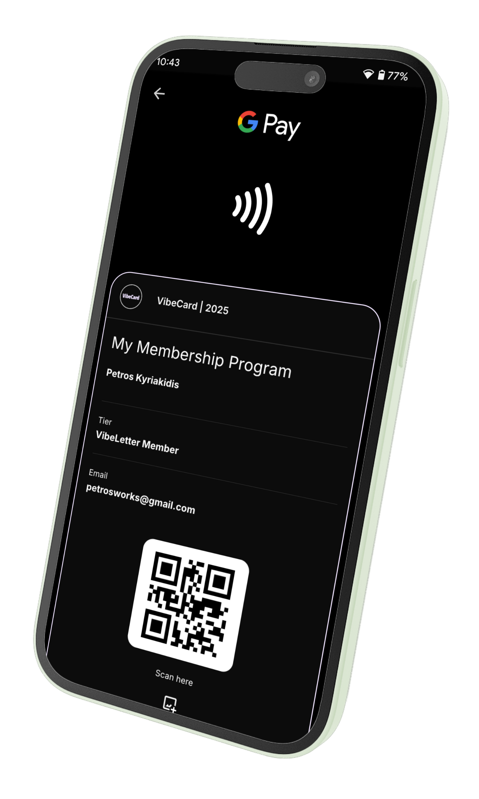 Η VibeCard είναι 100% ψηφιακή – παίρνεις άμεσα email με το link για να την κατεβάσεις στο κινητό σου (Apple/Google Wallet).
